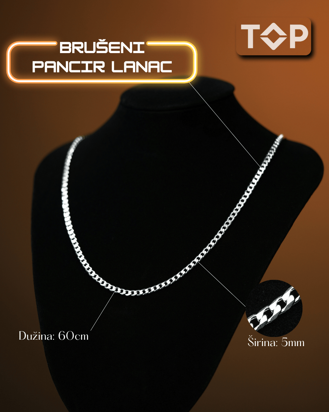 Dimenzije Lanca: Dužina: 60cm, Širina: oko 5mm